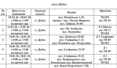 У зв’язку з виконанням планових ремонтних робіт на обладнанні Дубенської дільниці ПрАТ «Рівнеобленерго» у січні 2026 року буде тимчасово припинятись електропостачання споживачам у...