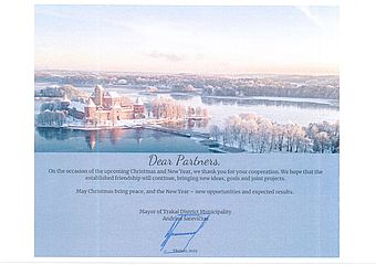 На адресу Дубенської міської ради надійшли вітання з нагоди Різдвяних та Новорічних свят від закордонних партнерів нашого міста: муніципалітетів міст Соколув-Подляській (Польща), Рокишкіс (Литва), Оксфорд (США) та Тракай (Литва). У своїх листівках вони привітали жителів Дубенської міської територіальної громади зі святами, а також побажали щасливого Різдва та Нового року, миру, здоров’я та досягнення цілей.