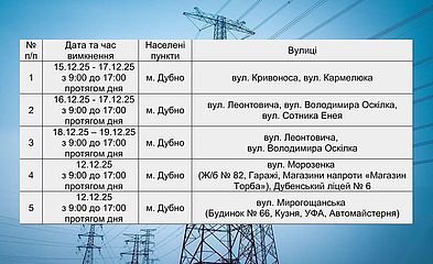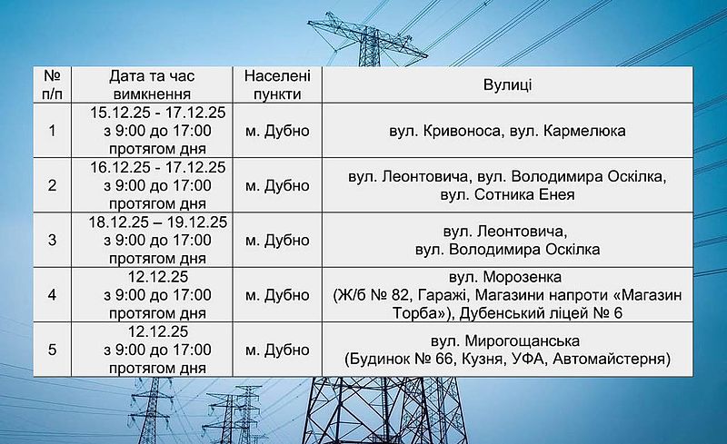 У зв’язку з виконанням планових ремонтних робіт на обладнанні Дубенської дільниці у грудні 2025 року буде тимчасово припинятись електропостачання наступним споживачам у місті Дубно