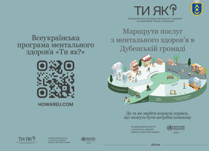 Маршрути послуг з ментального здоров'я у Дубенській горомаді - це універсальний посібник для кожного жителя. В одному виданні зібрана інформація про всі послуги з ментального здоров'я на території. За потреби, кожен зможе знайти саме те, що йому потрібно, зв'язатись з надавачем послуг та її отримати. Впевнені, що цей посібник стане корисним для кожного. Звісно, необов'язково, що всім знадобляться ці послуги, але знати, де та як їх знайти має право кожен. Адже повномасштабна війна і те, що через неї переживає кожен українець та українка, є потенційно травматичним досвідом. Те, що ми проходимо зараз як суспільство, фахівці називають колективною травмою. Тому саме зараз ми теж потребуємо стійкості, щоби вистояти. Зберегти себе. Зберегти власне ментальне здоров'я. Це те, що має свом фокусом Всеукраїнська програма ментального здоров'я «Ти як?», яка впроваджується за ініціативою першої леді Олени Зеленської. Маршрути послуг з ментального здоров’я в Дубенській міській територіальній громаді