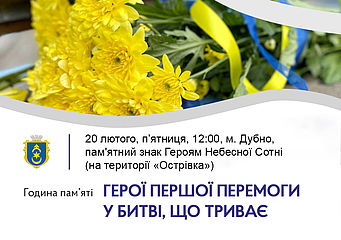 20 лютого у місті Дубно біля пам'ятного знаку Героям Небесної Сотні (на території «Острівка») відбудеться меморіальний захід «Герої першої перемоги у битві, що триває». Година пам’яті присвячена подвигу учасників Революції Гідності.