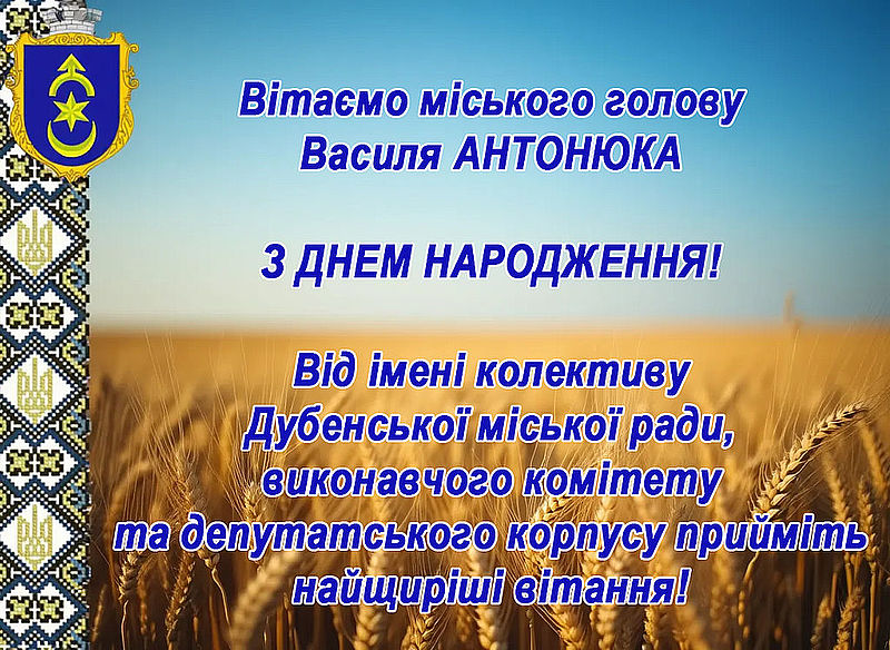 Сьогодні свій ювілейний день народження відзначає міський голова Дубна - Василь Михайлович Антонюк, який з 2010 року є очільником міста. Упродовж цих років, Ви не просто управляли громадою, але й відчували ритм рідного міста, прагнули змін та особисто працювали над їх втіленням. Були з громадою у години успіху й піднесення та залишаєтесь в години смутку та печалі - адже кожна наша втрата є болючим відбитком для усієї громади. Попри важкий період, який випав на долю українців під час повномасштабного вторгнення ворога, Дубенська громада під керівництвом Василя Антонюка є прикладом стійкості та сили. Ми підтримуємо Україну та допомагаємо нашим воїнам стояти на обороні рідної землі. Ми заручились важливою міжнародною підтримкою та здобули важливих партнерів в Україні та за кордоном. Ми реалізовуємо проєкти, які роблять нашу країну сильнішою. В цей урочистий день, від імені усієї Дубенської громади, вітаємо міського голову Василя Антонюка з ювілеєм! Бажаємо здійснення головної мрії - перемоги України та якнайшвидшого повернення додому усіх воїнів, які стоять на захисті нашої землі. А ще бажаємо - міцного здоров’я, спокою в душі, родинного тепла та натхнення втілювати добрі справи на благо громади. Нехай кожен день дарує світло та зміцнює віру, а повага людей буде найвищою нагородою за Вашу працю.