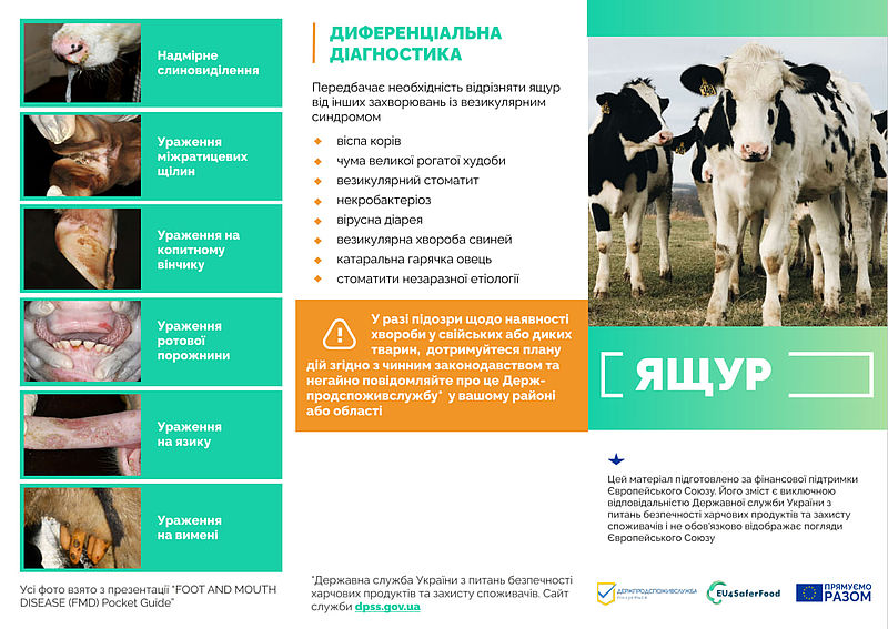 Дубенське районне управління Головного управління Держпродспоживслужби в Рівненській області у зв'язку із загостренням епізоотичної ситуації щодо ящуру в сусідніх країнах та підвищенням ризику занесення ящуру на територію України і області у весняний період 2026 року з метою посилення заходів, спрямованих на раннє виявлення надзвичайних ситуацій, пов'язаних з захворюваннями тварин, інформує. Ящур - небезпечна вірусна хвороба, що призводить до загибелі поголів'я свійських парнокопитних тварин, а також може передаватися людині. Серед клінічних ознак ящуру – пухирці заповненні рідиною (везикули) в ротовій порожнині, на вимені, кінцівках, а також слиновиділення, кульгавість, втрата молочної продуктивності, лихоманка тощо. Власники корів, кіз, свиней, та інших парнокопитних можуть убезпечити своє поголів'я від інфікування ящуром дотримуючись простих правил біобезпеки. Вірус ящуру може переноситись з кормами, на приладді, транспорті, взутті та одязі, і навіть вітром. У разі підозри щодо наявності хвороби у тварин необхідно негайно повідомити територіальний орган Держпродспоживслужби в регіоні.