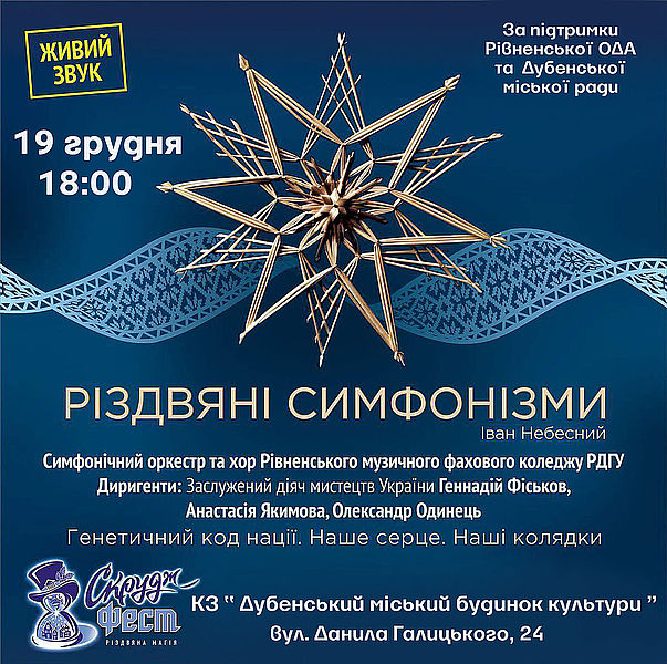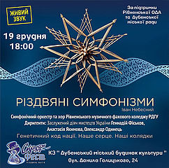 У п'ятницю, 19 грудня, о 18.00 у КЗ «Дубенський міський будинок культури» відбудеться культурно-мистецький захід - концерт Відокремленого структурного підрозділу «Рівненський музичний фаховий коледж Рівненського державного гуманітарного університету» «Різдвяні симфонізми» в рамках Різдвяного туру, який проходить за підтримки Рівненської обласної державної адміністрації.